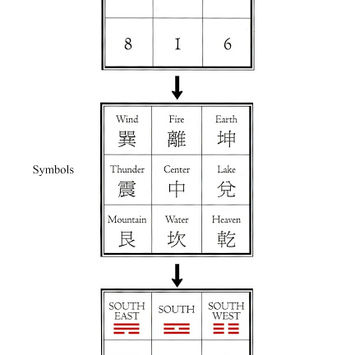 In the I Ching, Pa-Kua are eight symbols of forces of nature– the Palaces of Heaven, Earth, Thunder, Wind, Water, Fire, Mountain and Lake. The Middle space in this configuration is dedicated to The Palace of the Great Void.